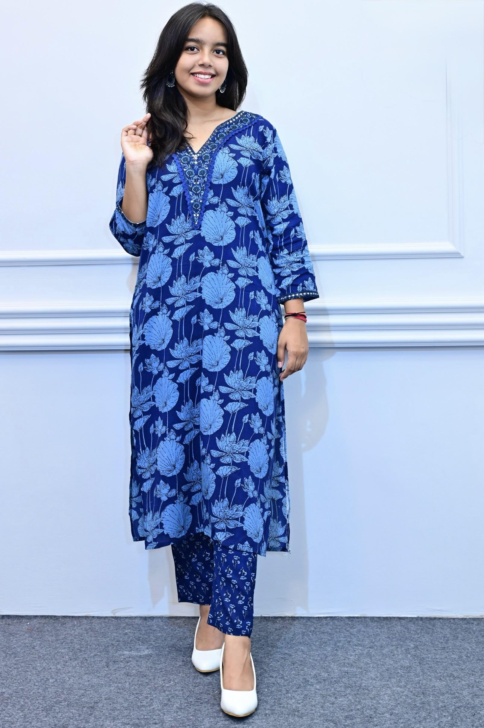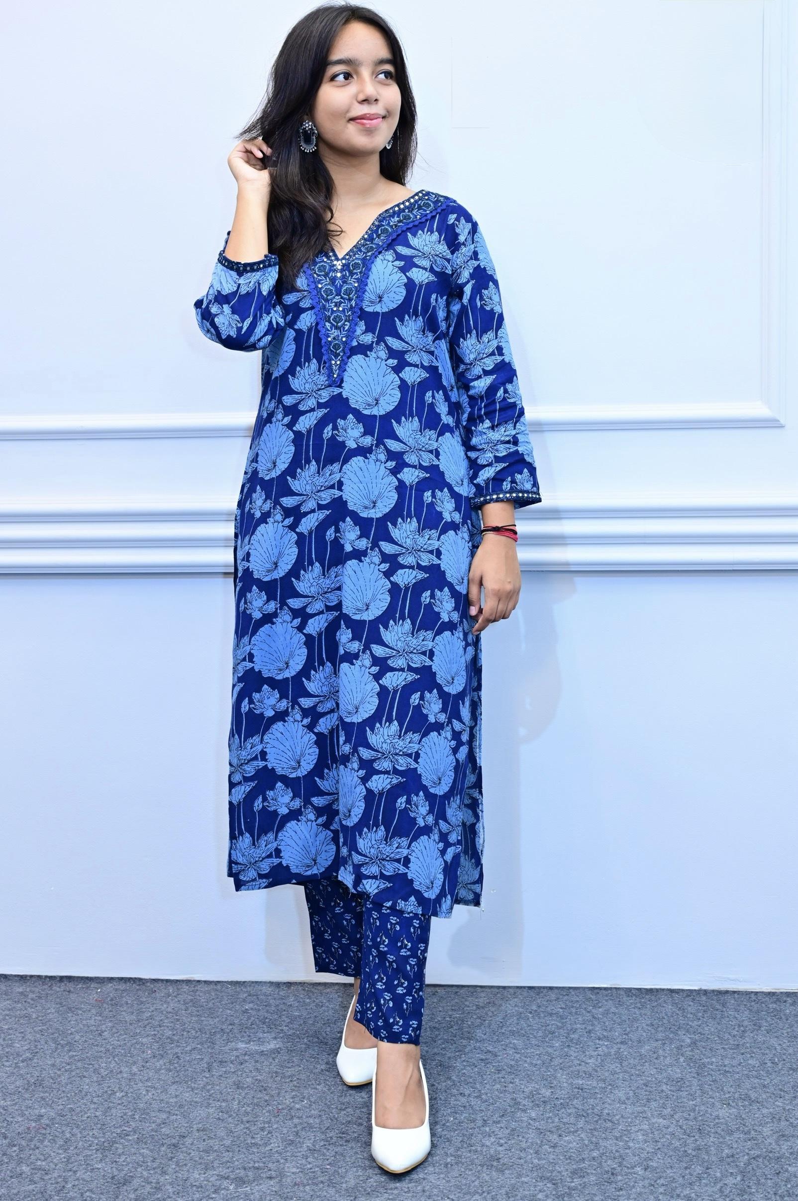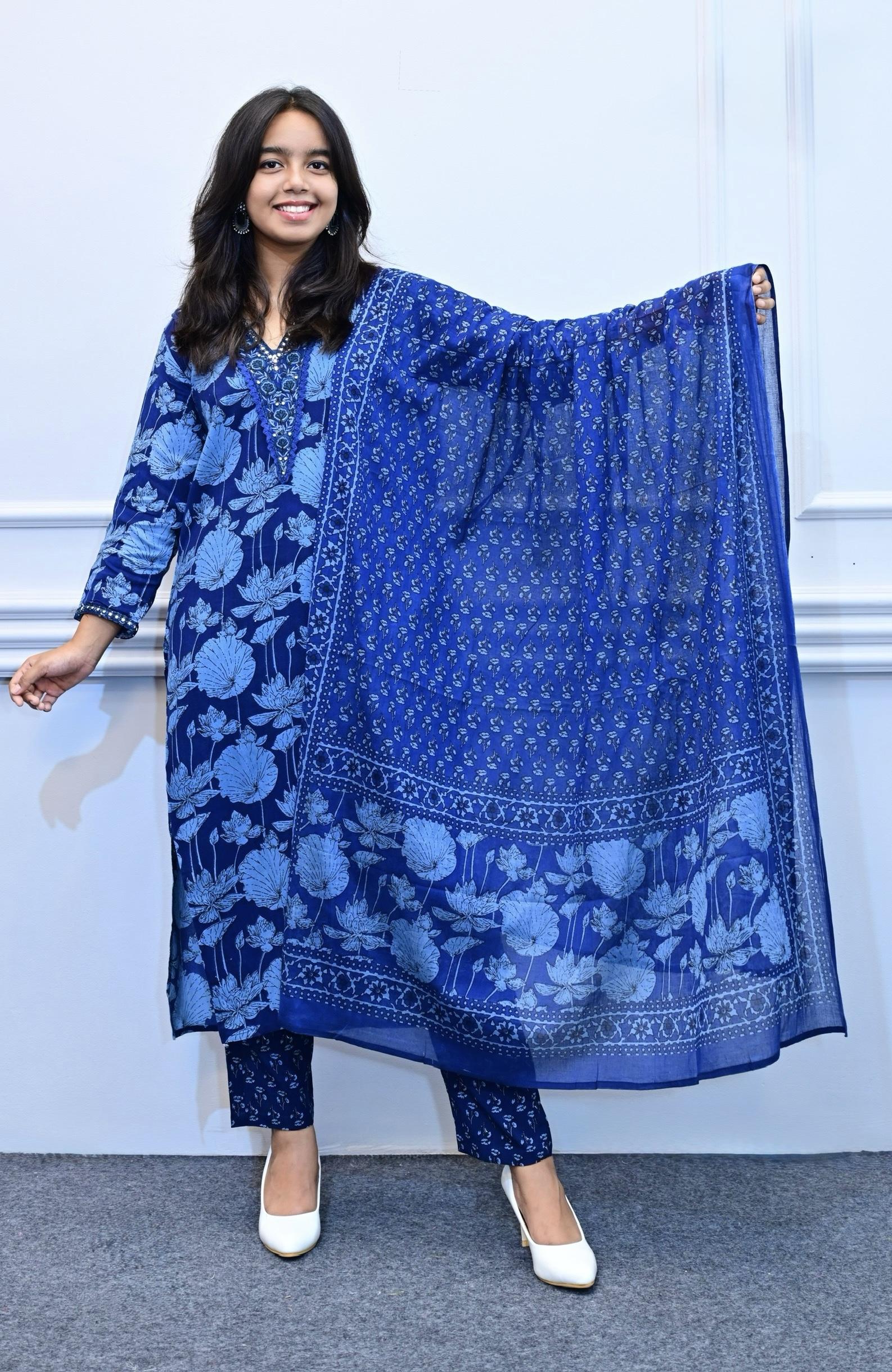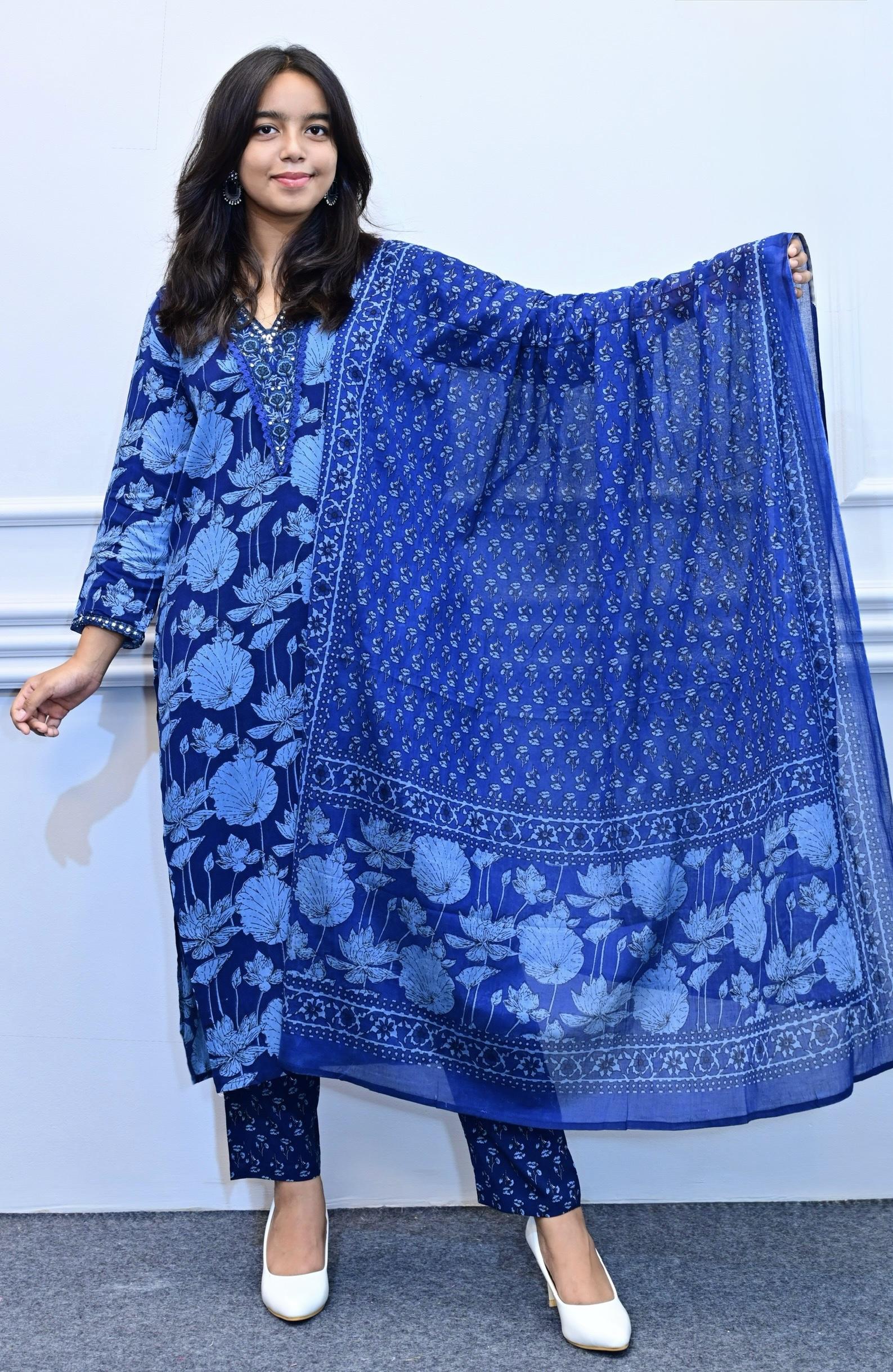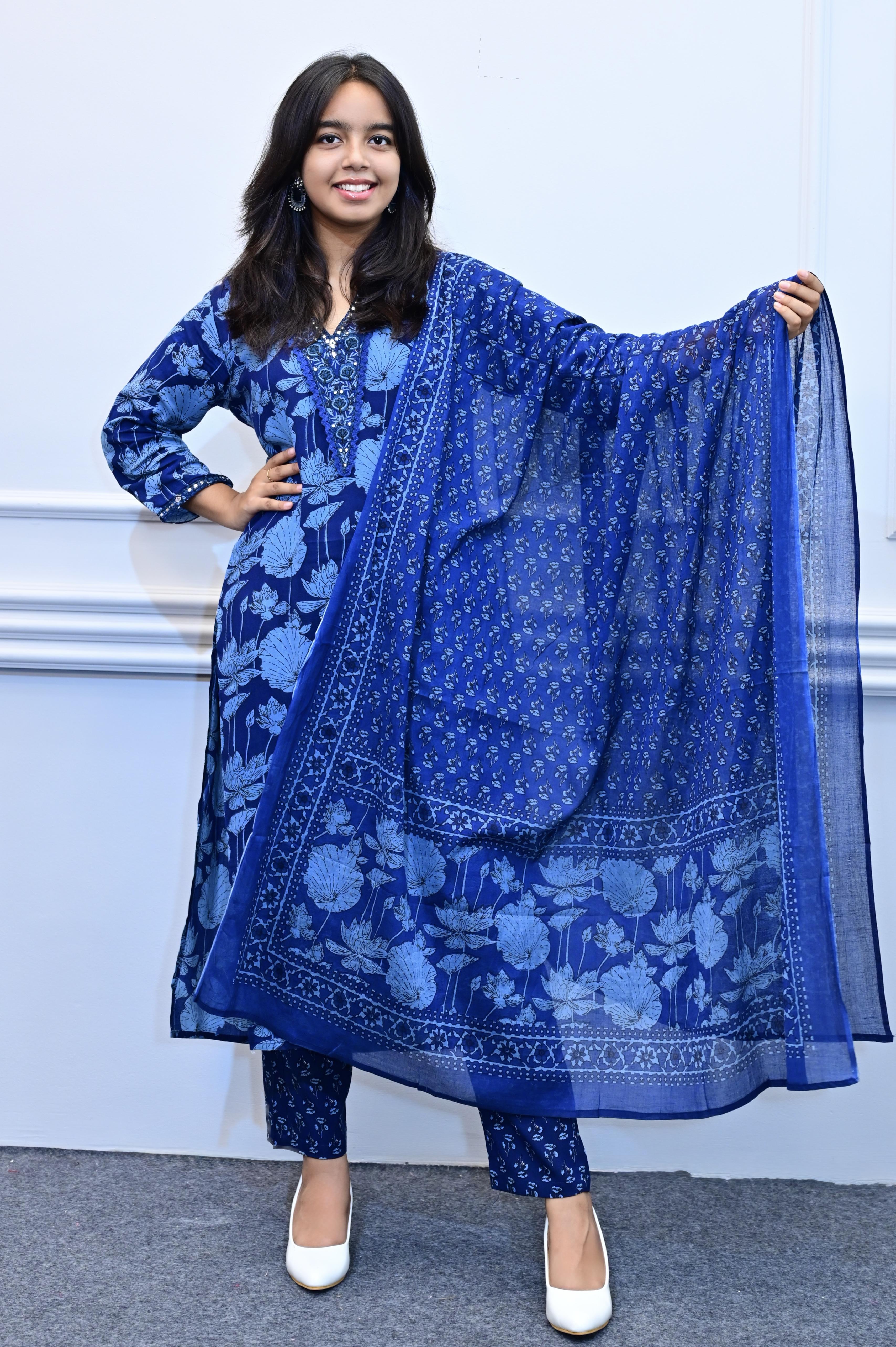 Deep blue floral design 3piece suit set